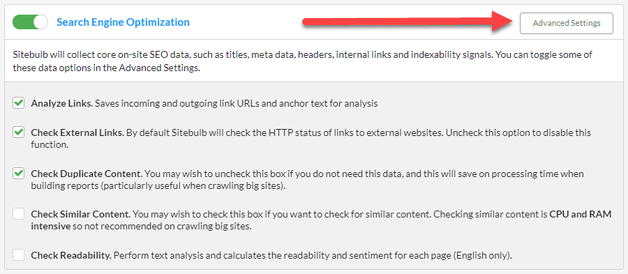 Every checkbox you tick will require Sitebulb to do more processing, which means the audit will take more time and will use more computer resources. On some computers, ticking every single box will mean that it is very difficult to continue doing other tasks.