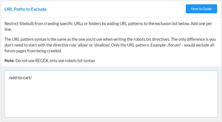The example below means that Sitebulb will not crawl any URLs it encounters that start with the string: https://shop.ee.co.uk/add-to-cart/- it will not schedule these URLs to be crawled, so they won't appear in your reports at all.