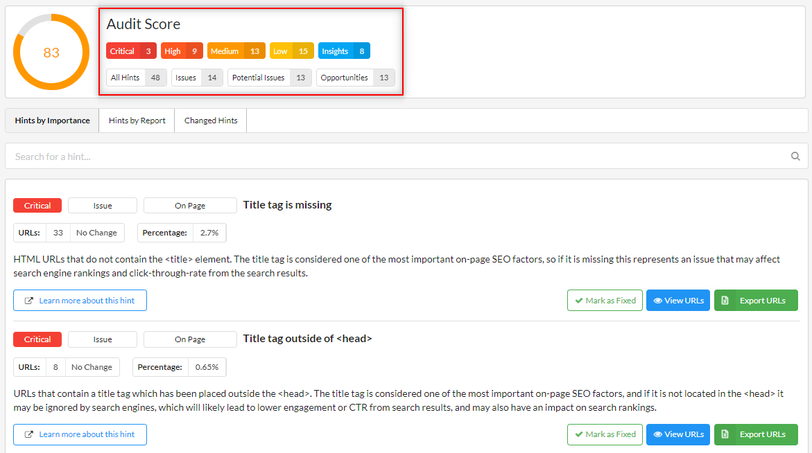 All Sitebulb Hints provide you with descriptions, links to detailed information and the option to export or view the URLs affected.