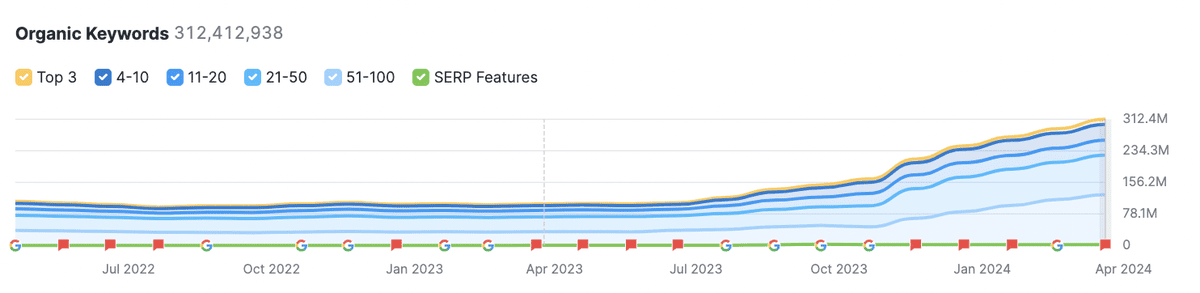 Another signal that UGC is starting to play a big role in search is the recent appearance of the SERPS. Websites that are driven by UGC such as Reddit and Quora are gaining visibility. See below Reddit Semrush ranking trend.