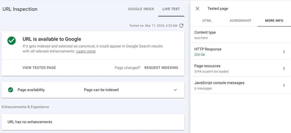 Google Search Console offers its URL Inspection Tool, which allows you to inspect an individual page using the Test Live URL button. You can view the page’s rendered HTML, a screenshot to visually see what content Google can access on the page, as well as any page resources that couldn’t be loaded and JavaScript console messages.