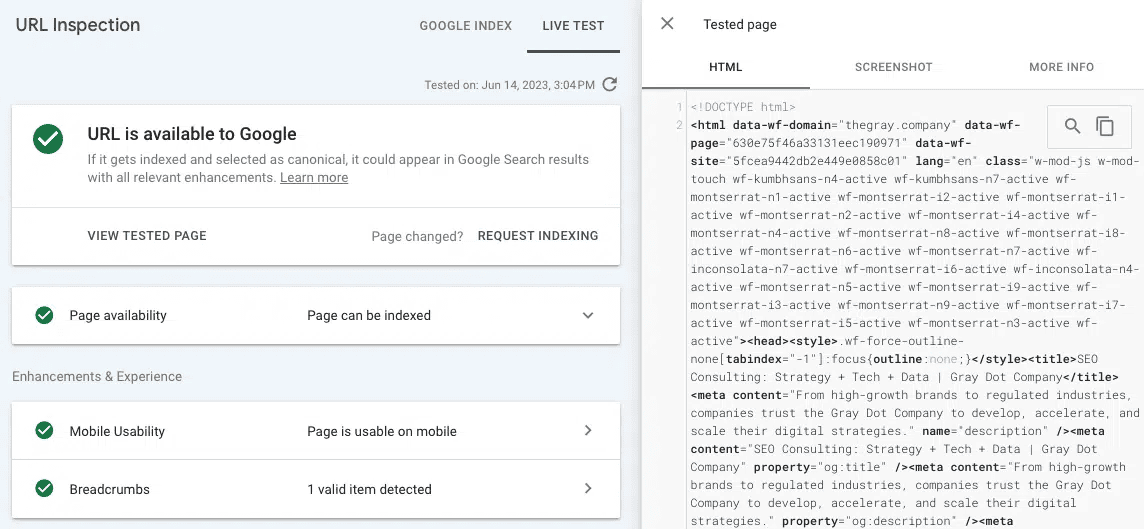 Once it runs the test, the “View Tested Page” option will pull up the rendered HTML and more. The downside is that you'll have to find SEO elements manually, using the search function to locate them in the code.