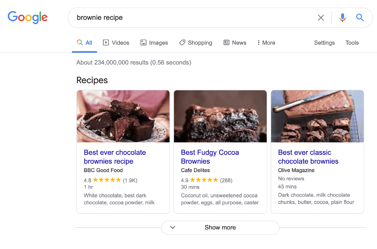 The structured data of choice for most search engines is Schema markup. Using Schema markup on your webpage can mean more real estate in the SERPs. The more space you can take up, the more eye-catching your result is—and more chance you have of people clicking your result over others.