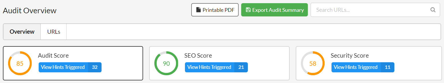 Every audit comes with a set of scores out of 100. Scores deliver instant meaning and provide a framework for further investigation; you can quickly spot areas of weakness to dive into, then scan through the prioritized Hints to understand what is holding the site back.