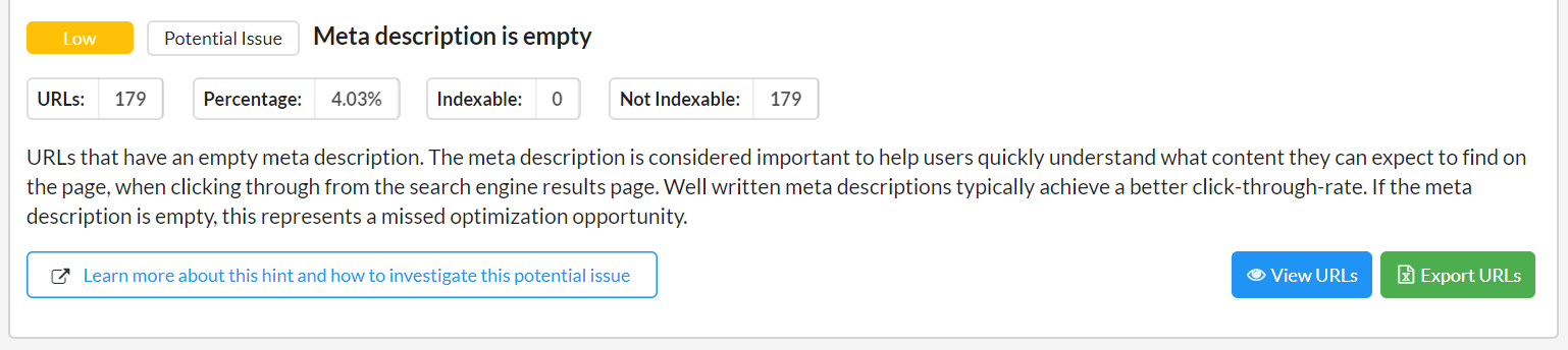 It also shows you how much of the site is affected, and whether these are indexable or not indexable URLs. All of this data provides the additional context you need in order to make quick decisions.