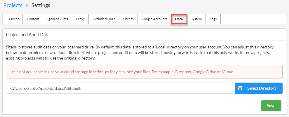 From here, the 'Project Data' tab allows you to control where Sitebulb stores your audit data, on your computer.