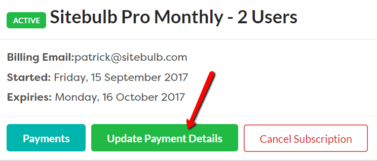 This will take you through to a big page with all the details of your subscription. Hit the green button Update Payment Details.