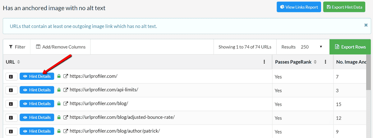 From the URL List, click the blue Hint Details button, which will bring up a slide-across window with specific details about the Hint for each URL.