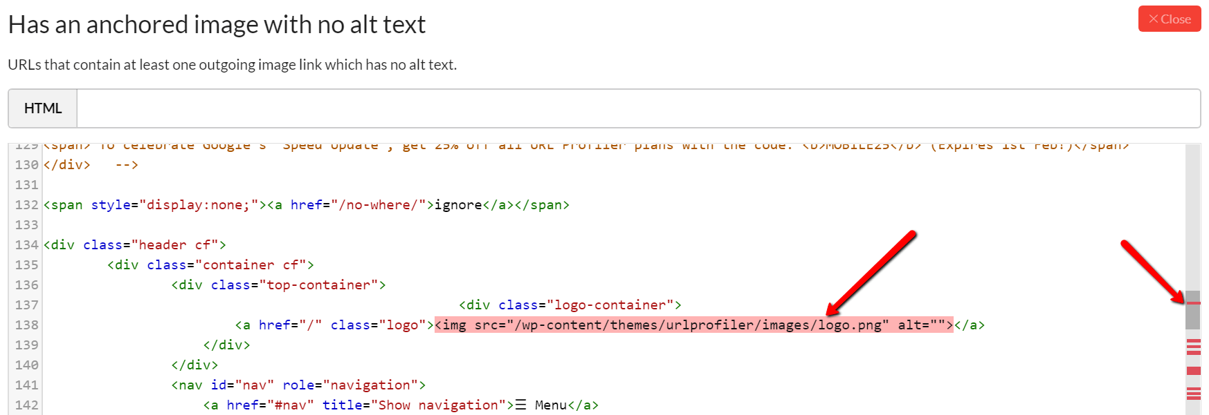 This will show you any outgoing anchored images with no alt text, highlighted in red in the HTML. The right-hand scrollbar will show you the area to scroll down to, and then once you have scrolled you will see the highlighted link in red.