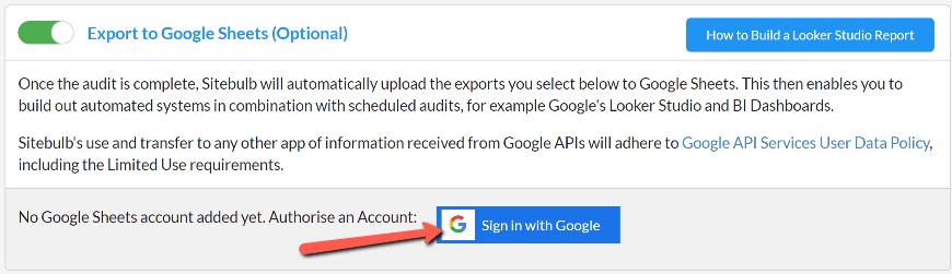 If you already have Google Sheets accounts authenticated through Sitebulb, you can select one of these, otherwise you'll need to authorise permissions for a new account.
